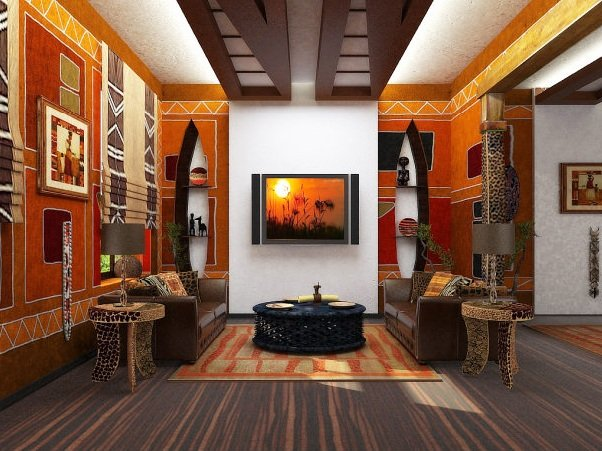 Африканская эстетика любит натуральность: бамбук, шерсть и элементы охотничьей символики. Цвета — желто-коричневые в сочетании с черным — создают яркую и цельную палитру.