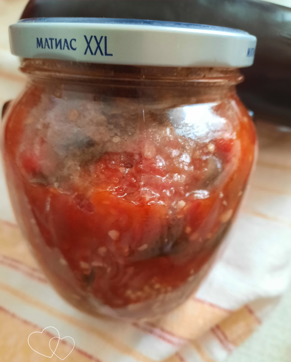 Удача такой заготовки — в простоте: баклажаны режут крупными кубиками, остальные ингредиенты пробиваются блендером и тушатся вместе, затем засыпаются баклажаны и продолжают готовиться на слабом огне. В конце добавляют уксус, чтобы сохранить аромат и яркость вкуса.