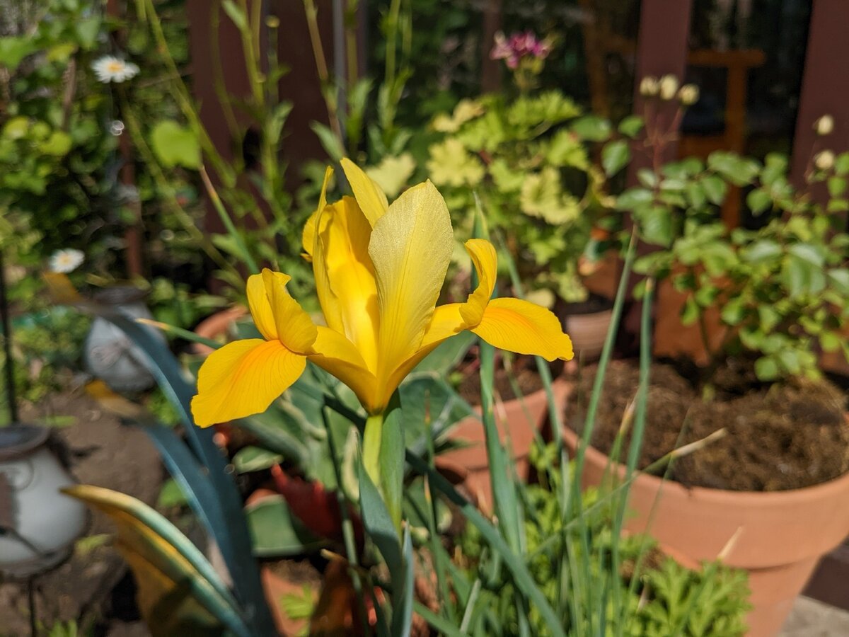 Непонятный же второй ирис, который должен был меня порадовать желтыми цветами, не только не зацвел, но и нарастил всего три ростка вместо положенных десяти. И когда ирис непотопляемо проболтался в огороде, ожидая своей участи, он вдруг распустил цветы в июне. Увы, это оказался не иридодиктиум, а ксифиум, с которым у садовода были лишь неприятные ассоциации. Не желая долго держать это капризное растение, его оставили на крыльце только для фотосессий, ведь конкурировать с высокими бородатыми ирисами ему не удалось.