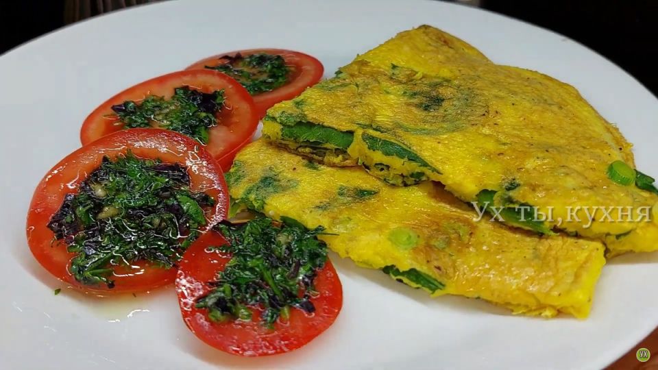 Разогрейте сковороду с топленным маслом, вылейте яичную смесь и готовьте под крышкой на среднем огне около 10 минут. Затем аккуратно переверните омлет и доведите до готовности еще 2 минуты. Подавайте омлет с подготовленной закуской из помидоров, добавив немного маринада на тарелку.