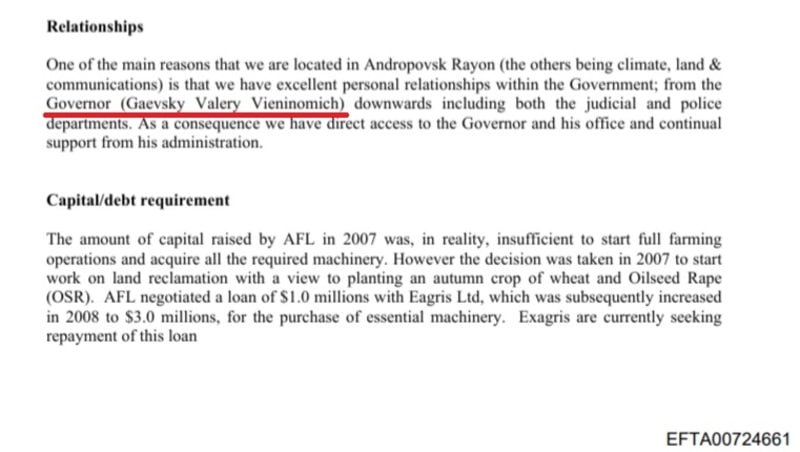 «Одна из главных причин, почему мы расположены в Андроповском районе (помимо прочих, таких как климат, земля и коммуникации), состоит в том, что у нас отличные личные отношения с правительством: начиная с губернатора (Гаевский Валерий Вениаминович) и заканчивая судебными органами и полицией», — говорится в документе.