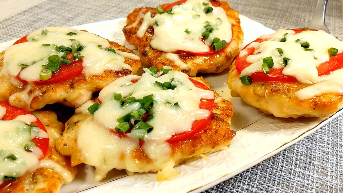 Если выбран вариант с сковородой, выкладываем порции на горячую поверхность, обжариваем с обеих сторон, а затем укладываем сверху кружочек помидора, немного зелёного лука и сыр. Накрываем крышкой на несколько минут, пока сыр не расплавится.