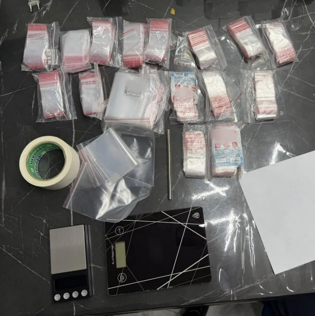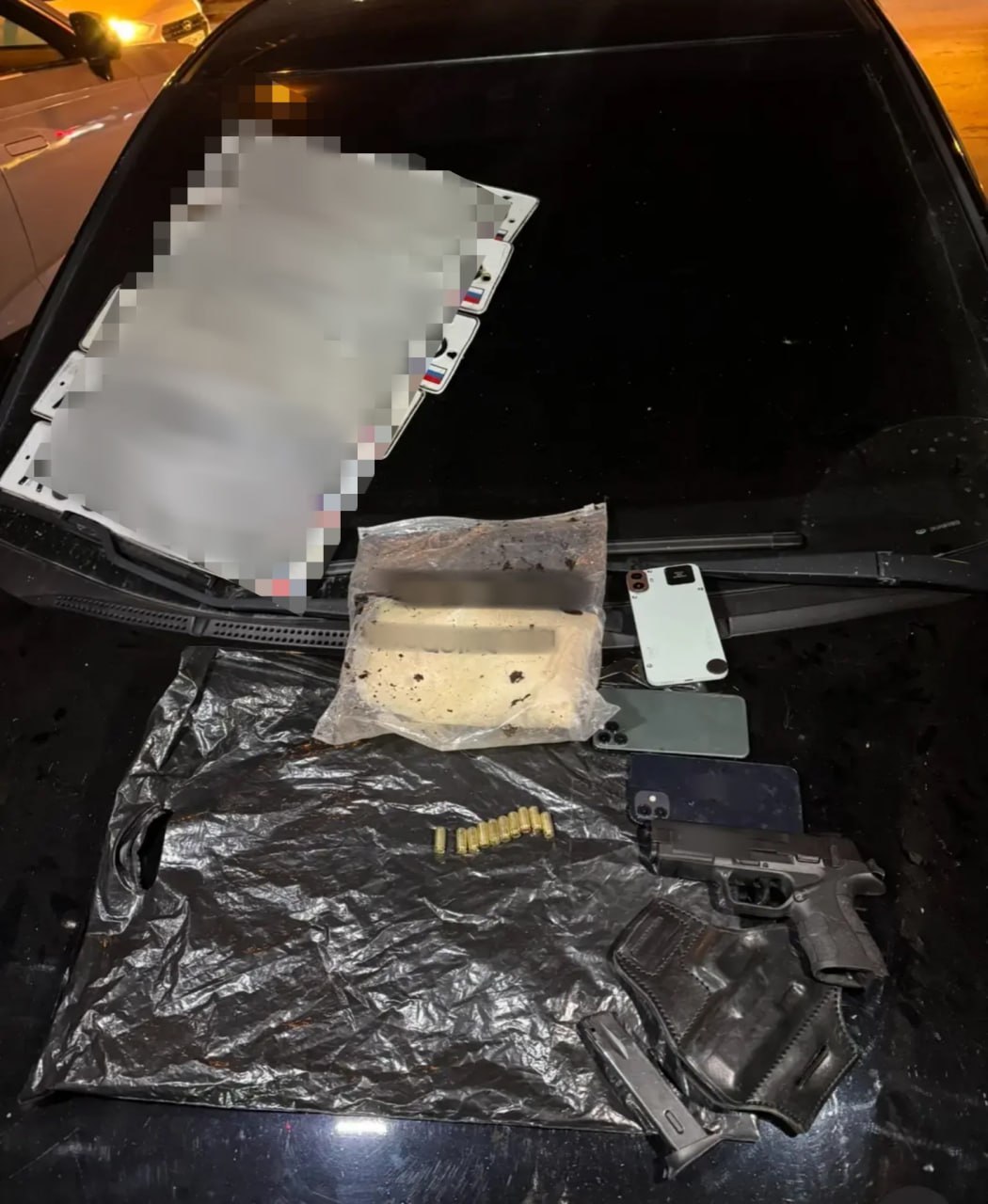 В ходе осмотра автомобиля был обнаружен и изъят черный полимерный пакет. Внутри него находилось сыпучее вещество. Также в машине нашли охолощенный пистолет и патроны к нему, три смартфона и различные государственные регистрационные знаки.