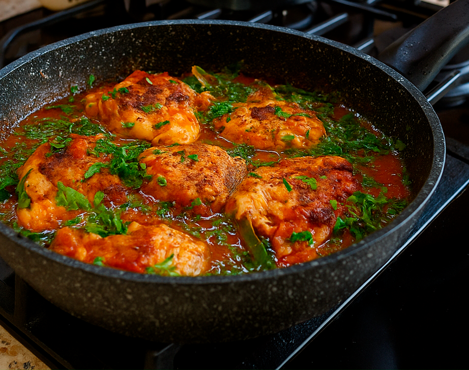 Теперь возвратите бёдра в сковороду, накройте крышкой, убавьте огонь до минимума и оставьте тушиться на 40 минут. После 20 минут аккуратно переверните бёдра, чтобы они пропитались ароматами.