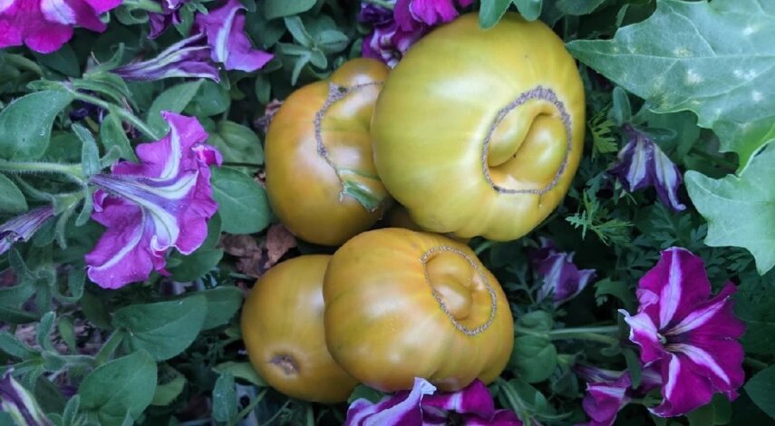 Сорт из Германии, дающий крепкий куст высотой до 2 метров. Плоды 200–350 граммов в кисти выглядят нарядно: кожа ближе к хаки, мякоть плотная и сладкая с лёгким пряным оттенком. Ранний вкус раскрывается полноценно при полном созревании, урожайность остаётся стабильной даже в жару.