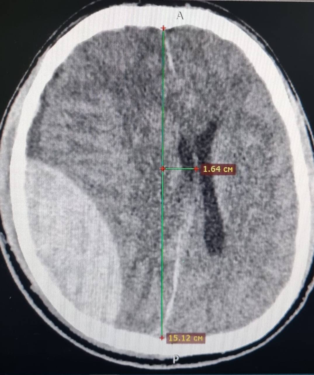 На серии КТ-снимков врачи выявили перелом черепа с эпидуральной гематомой, вызвавшей отёк мозга и смещение его срединных структур. Это скопление крови между костями черепа и мозгом — крайне опасное и редкое, на его долю приходится меньше 2% всех случаев.