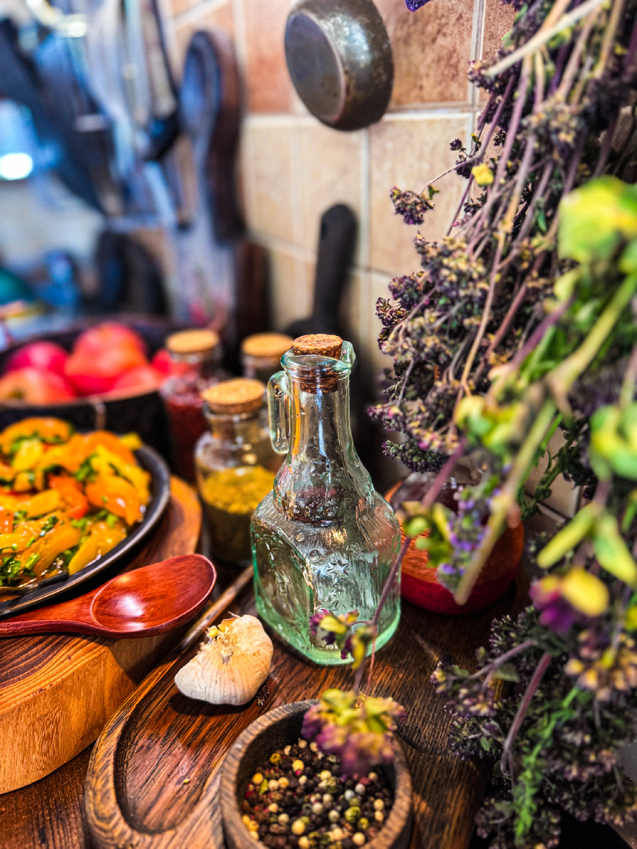 - Здесь присутствуют плошки, деревяшки и висит множество трав — все это приносит уют и тепло.
