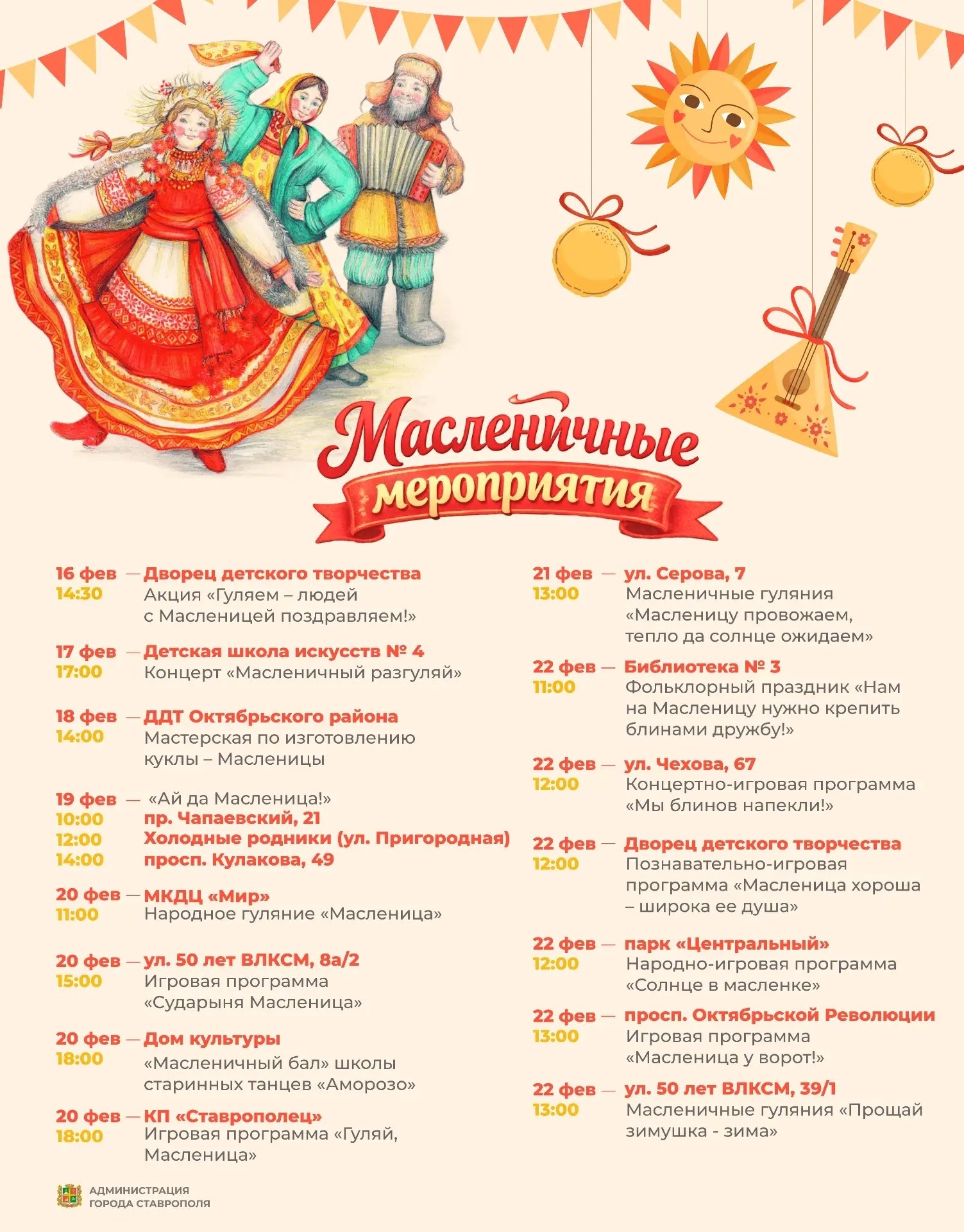В программе — концерты, мастер-классы по изготовлению кукол-Маслениц, народные игры, интерактивные программы и кукольные спектакли на разных площадках города. Неделя завершится 22 февраля «Прощеным воскресеньем» с игровыми и концертными мероприятиями, народными гуляниями и блинами.
