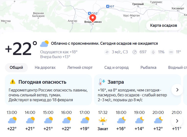Если верить прогнозу погоды, во Владикавказе прямо сейчас +22!