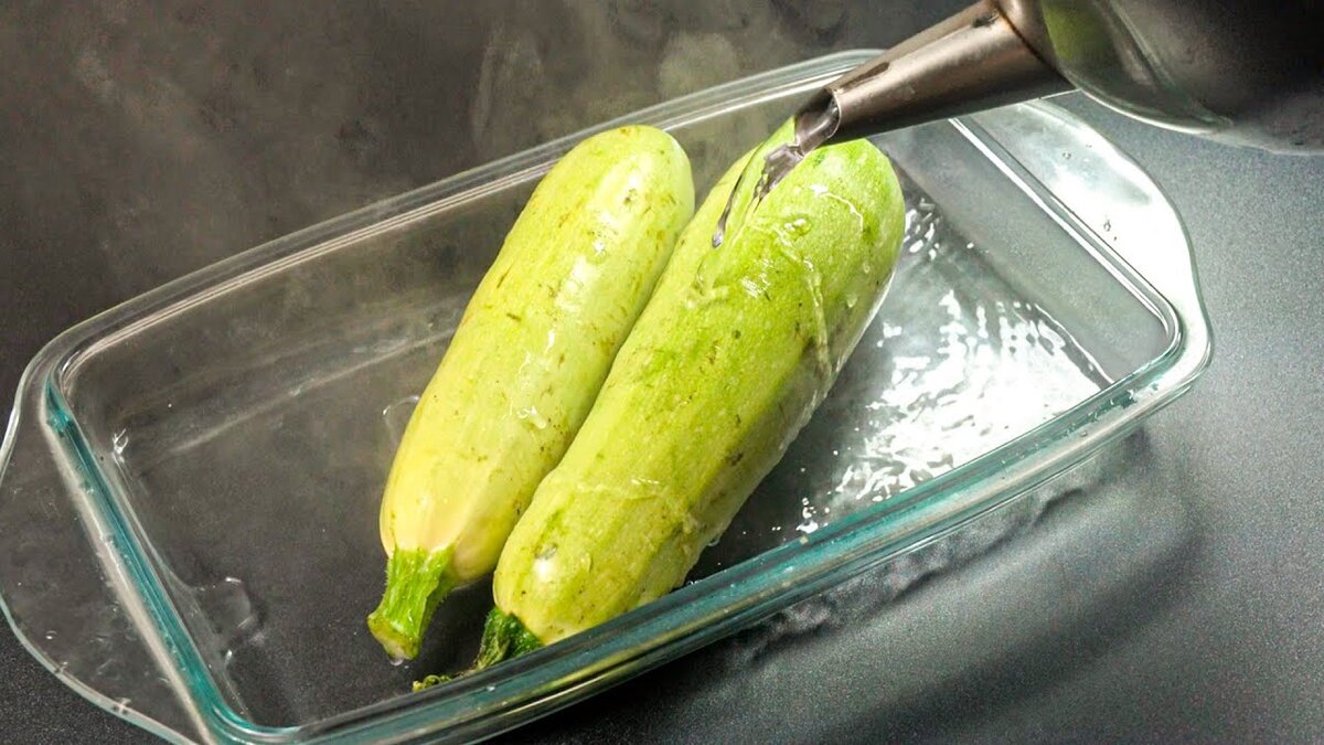 Первым делом необходимо тщательно промыть кабачки и нарезать их на тонкие пластины. Затем поместить их в глубокую стеклянную посуду и залить кипятком. Накрыв крышкой, оставить до полного остывания воды.
