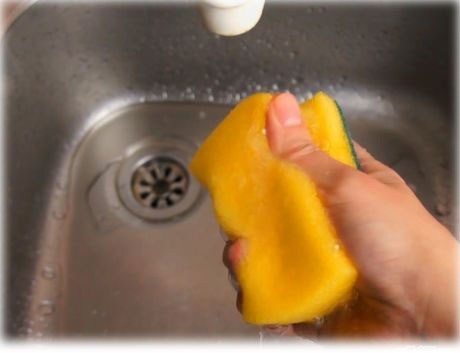 - Подготовка губки. После мытья посуды следует тщательно промыть губку под горячей водой для удаления видимой грязи. Это важный этап, так как чистая поверхность позволяет перекиси работать более эффективно.
