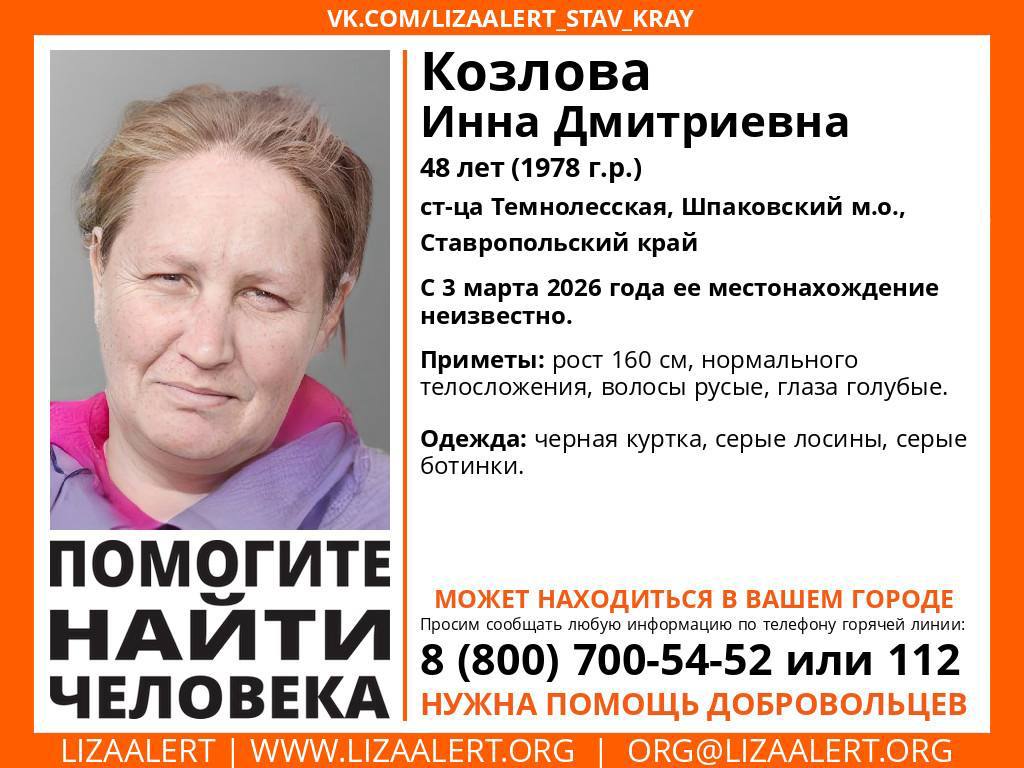 Местонахождение 48-летней Инны Козловой из станицы Темнолесской неизвестно с 3 марта, сообщает ПСО «ЛизаАлерт».