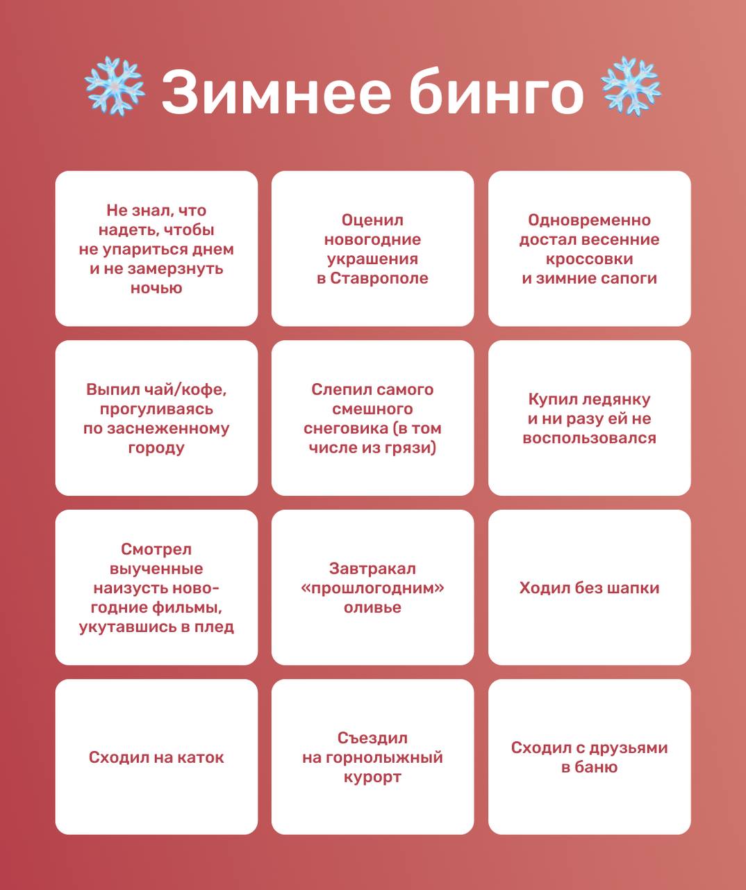 Предлагаем сыграть в бинго и отметить, какие пункты из плана на зиму удалось выполнить. Присылайте в комментарии, чем вам запомнилось это время года