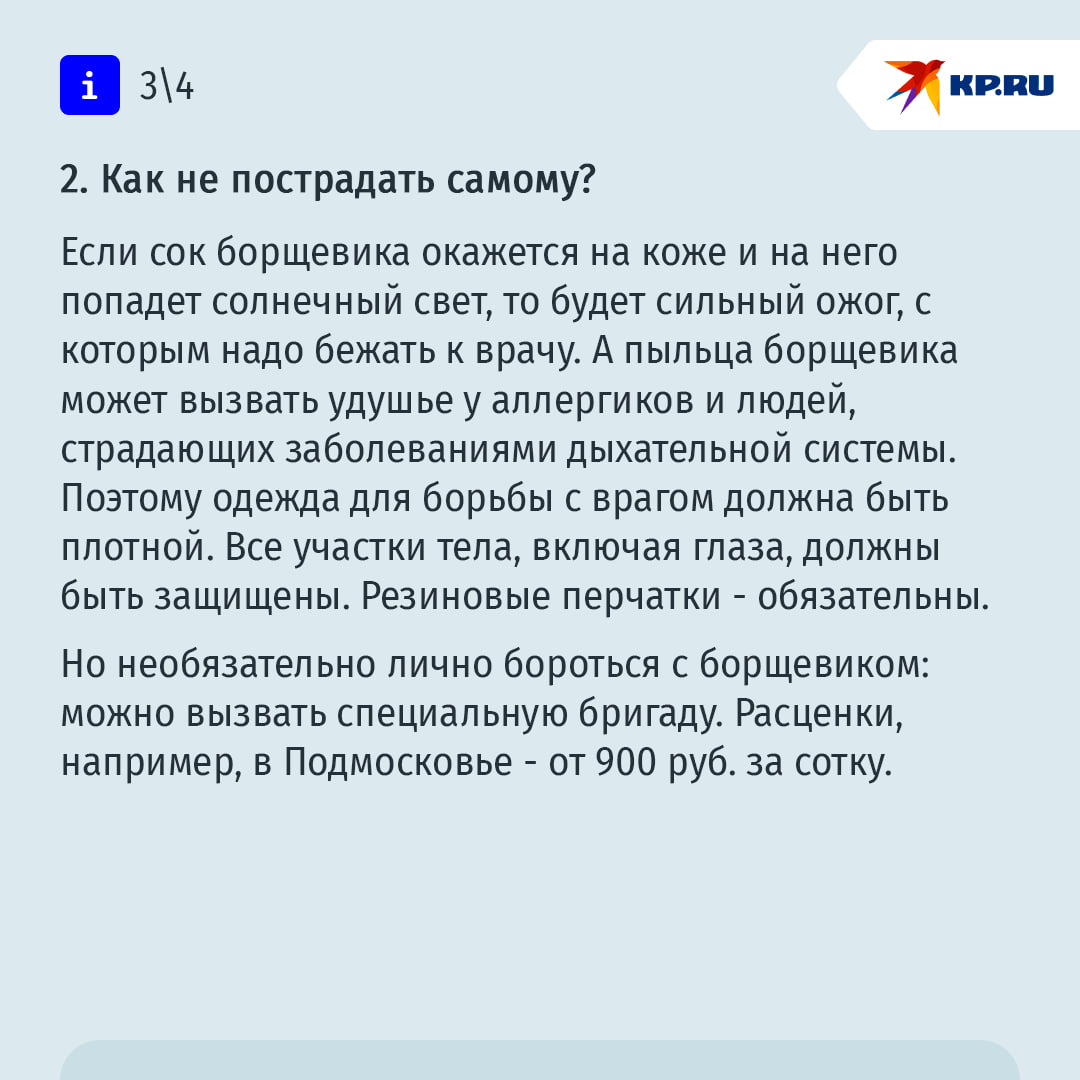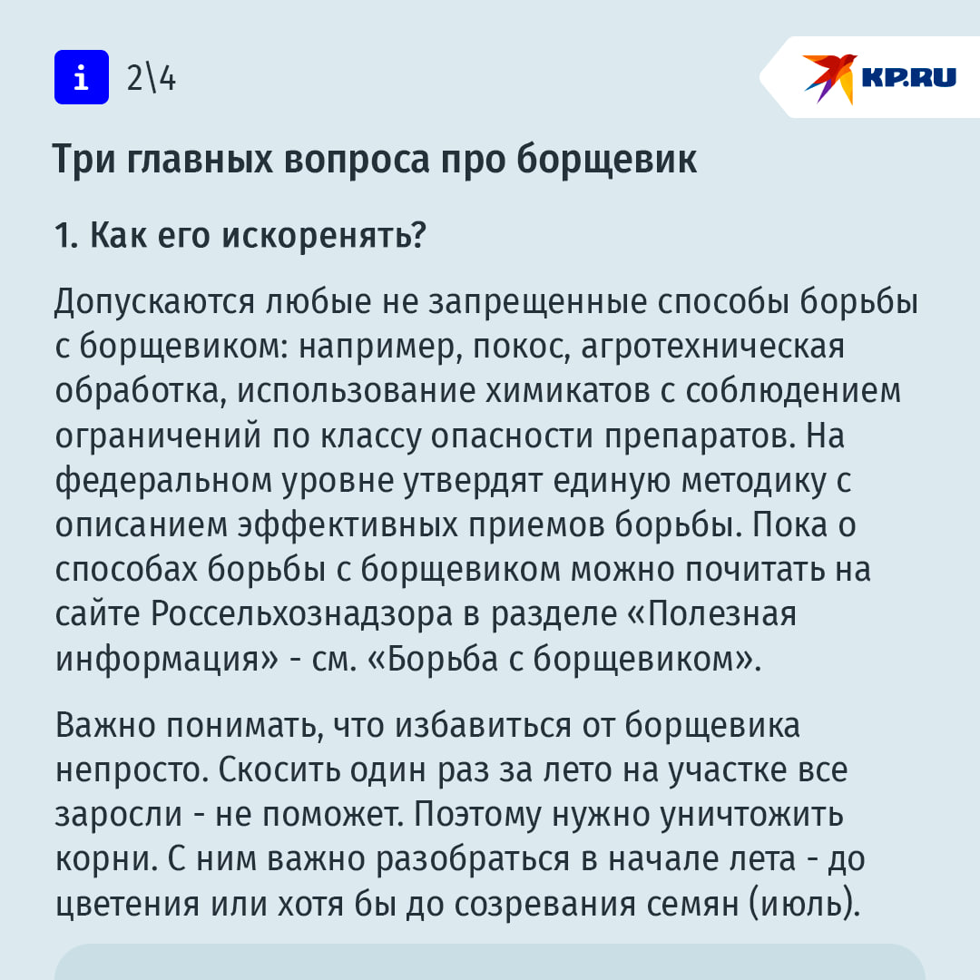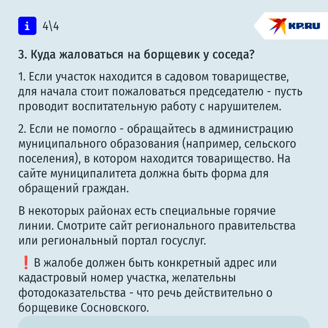 "Кроме борщевика Сосновского, к инвазивным растениям относятся, например, амброзия полыннолистная, золотарник канадский, люпин многолистный, недотрога железистая, элодея канадская, рейнутрия, клен американский. Ориентироваться надо на перечни опасных инвазивных растений, которые должны быть утверждены на уровне регионов для своих территорий. Такие списки публикуются на сайтах региональных правительств, Россельхознадзора или минприроды региона", - говорит юрист Валентина Куделина.
