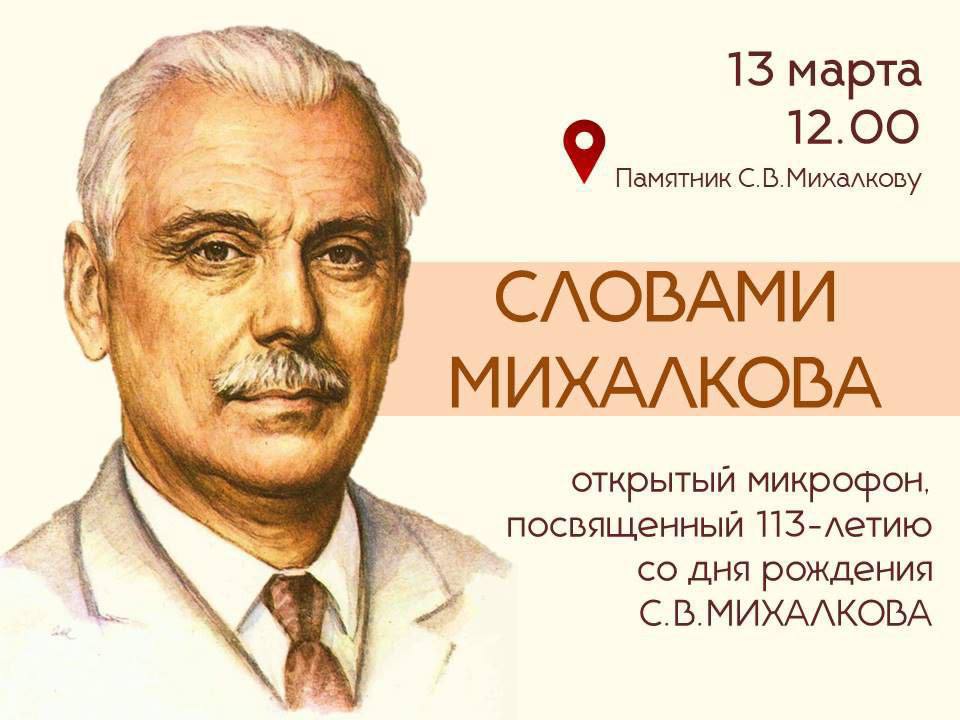 Традиционный мартовский открытый поэтический марафон, посвящённый дню рождения поэта, писателя и драматурга, «пятигорчанина с московской пропиской» Сергея Михалкова, состоится 13 марта в 12:00.