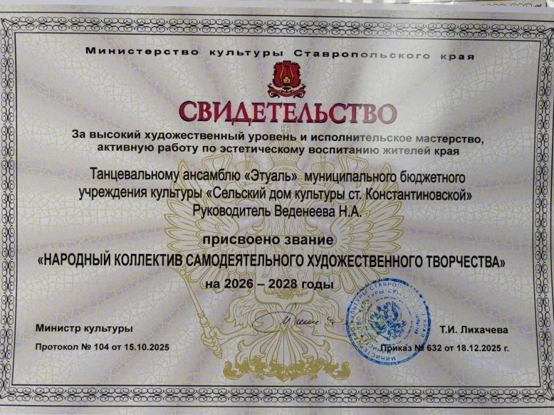 Звание подтверждено приказом и свидетельством Министерства культуры Ставропольского края.