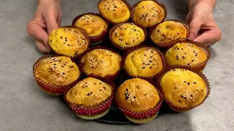 На следующем этапе нужно подготовить формы для выпечки. Укладываем бумажные вкладыши и заполняем их частью теста. Затем сверху уютно укладываем уже готовую начинку. Заключительный аккорд – заливаем оставшимся тестом и посыпаем семенами кунжута. Выпекаем в предварительно разогретой до 180°С духовке в течение 30-35 минут.