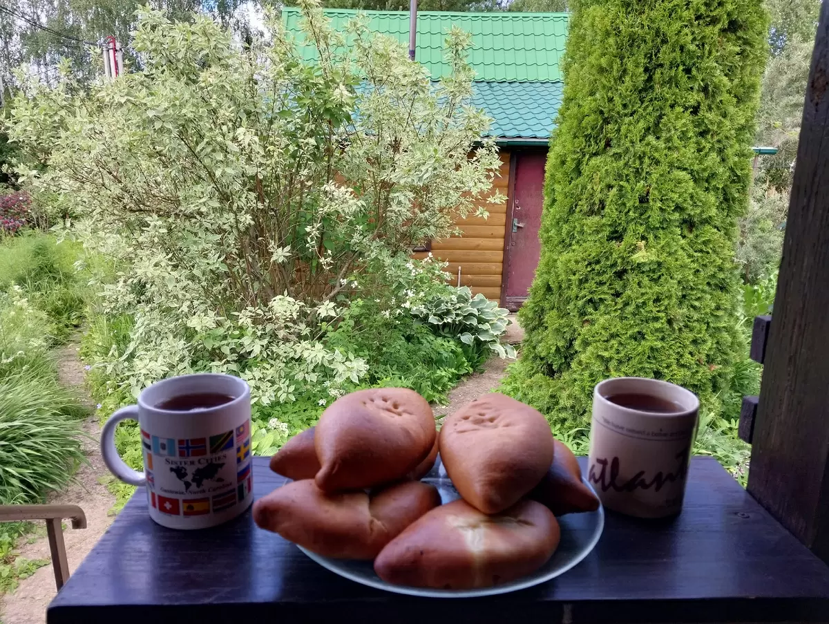 Воскресное утро на даче началось с зарядки, после которой приготовили чай и пироги. Погода оставалась тёплой, но пасмурной — идеальная атмосфера для наслаждения природой.