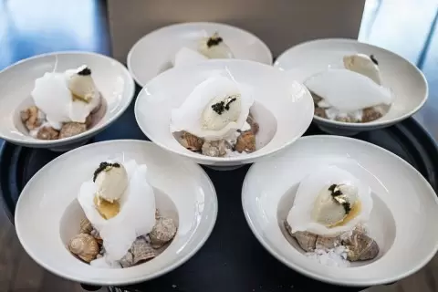 Кульминацией вечера стало насыщенное погружение в мир вкусов, где журналисты и фуд-блогеры смогли не только насладиться кулинарными шедеврами, но и пережить целый спектр эмоций. Удивляло даже десерт — устричное мороженое, представленное на раковине льда с черной икрой и пищевым золотом. Подачу украсили прозрачные шарики тапиоки, напоминающие икру, создавая эффектный визуальный праздник.