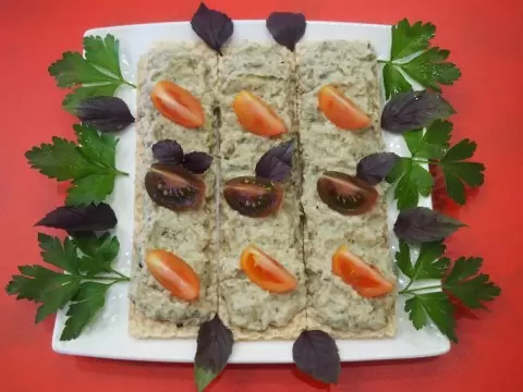Подавать намазку можно как на мягком, так и на поджаренном хлебе. Другое отличное решение – использовать хлебцы, которые придают блюду особую текстуру. Для украшения намазки добавляют свежие листья базилика, петрушки и дольки помидоров черри, создавая неповторимую подачу.