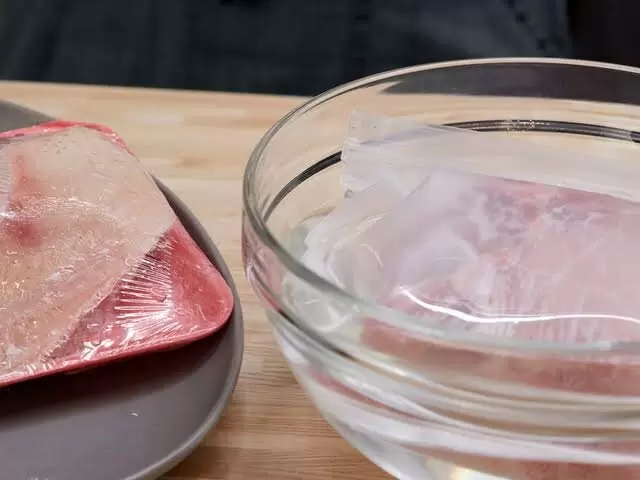 Солёный раствор ускоряет процесс разморозки вдвое по сравнению с обычной холодной водой. Соль понижает точку замерзания, и лед быстро начинает таять, не позволяя сокам вытекать.