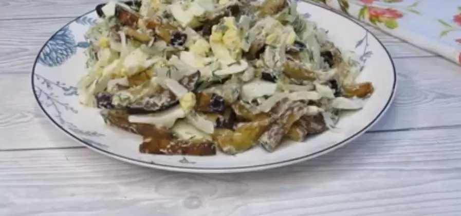 Во время того, как масло впитывается, нарезают яйца крупными кусочками. Затем все ингредиенты - баклажаны, яйца, маринованный лук и свежий укроп - объединяются в одной тарелке. Для завершения остаётся лишь добавить пару ложек майонеза, немного перца и соли по вкусу. Все тщательно перемешивают, и салат готов!