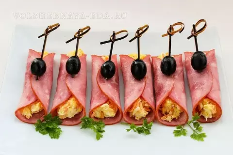 Эти великолепные рулетики подаются в охлажденном виде и прекрасно подходят для различных торжеств. Они станут не только вкусным угощением, но и визуальным украшением стола. Идеальное сочетание ветчины, сыра и моркови делает их фаворитом среди всех гостей.