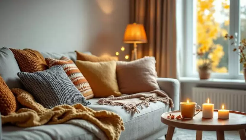 Добавьте мягкий текстиль. Пледы, ароматные подушки и уютные шторы могут преобразить атмосферу. Шершавая текстура, вязаные узоры и теплые оттенки, такие как горчичный и терракотовый, создают по-настоящему осеннее обаяние.