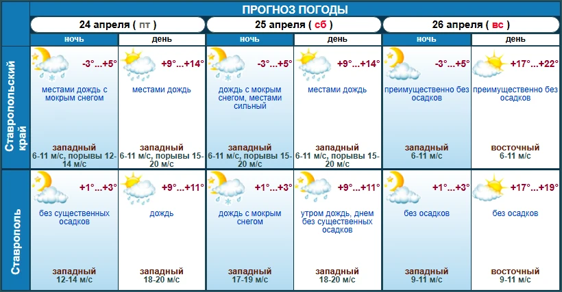 Зато в воскресенье погода кардинально меняется: ни осадков, ни сильного ветра не будет. В крае потеплеет аж до +22 градусов, а в Ставрополе – до +19.
