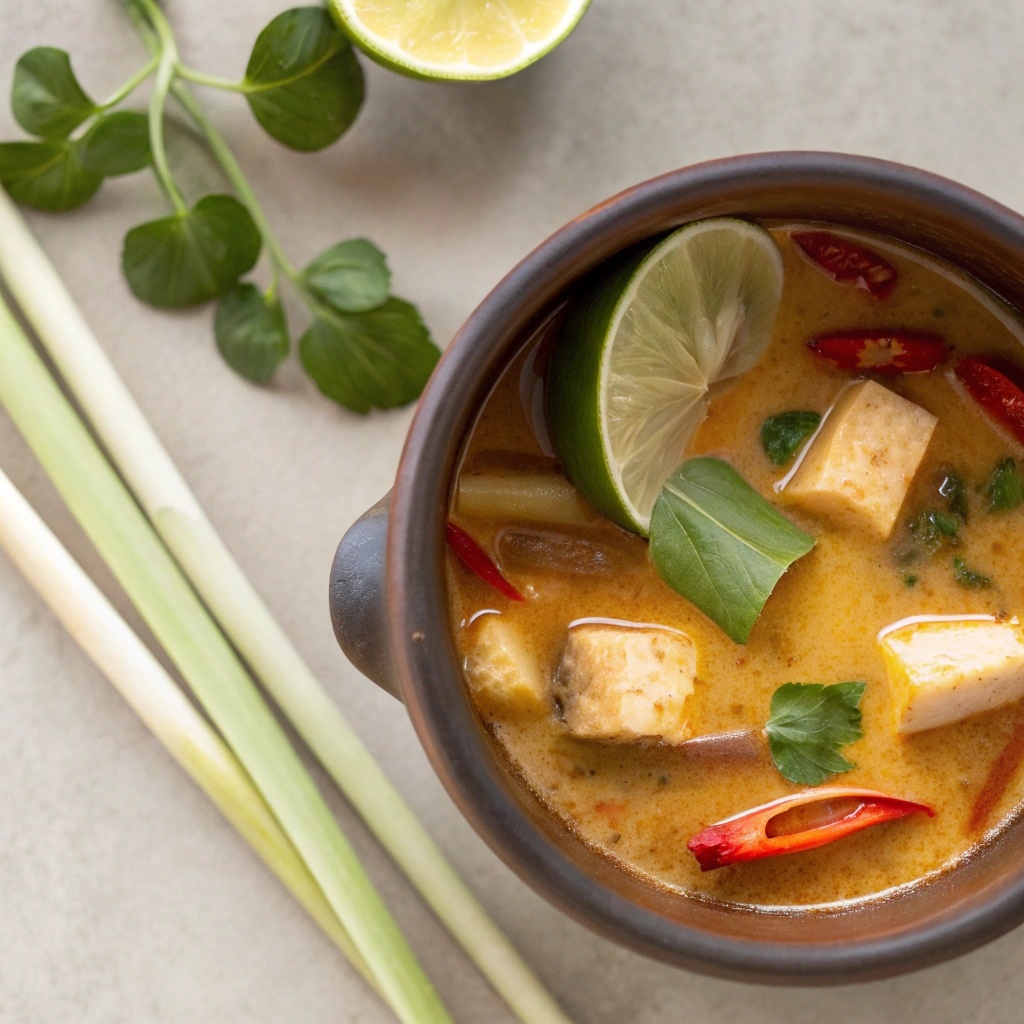 Сначала обжарьте лемонграсс и галангал в кокосовом молоке, добавьте тофу и чили, варите десять минут, затем влейте сок лайма и соевый соус. Подавайте с долькой лайма — и наслаждайтесь!