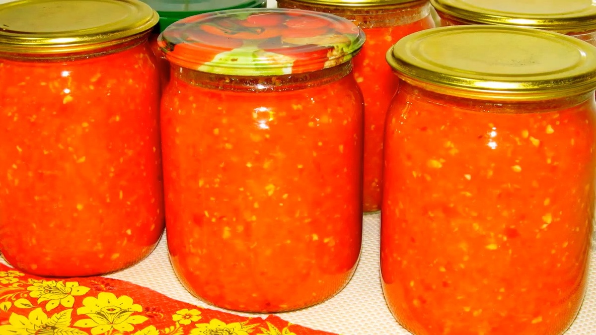 Мясистые помидоры, сладкий перец, морковь и яблоки измельчают в мясорубке. Остренький перец и чеснок перекручиваются отдельно. Далее всё смешивается в кастрюле и варится под крышкой на среднем огне около 50-60 минут, иногда помешивая, чтобы не пригорало. В конце влить растительное масло, добавить соль, сахар, чеснок и острый перец, тщательно перемешать. Разлить горячую массу в стерилизованные банки и плотно закрыть.