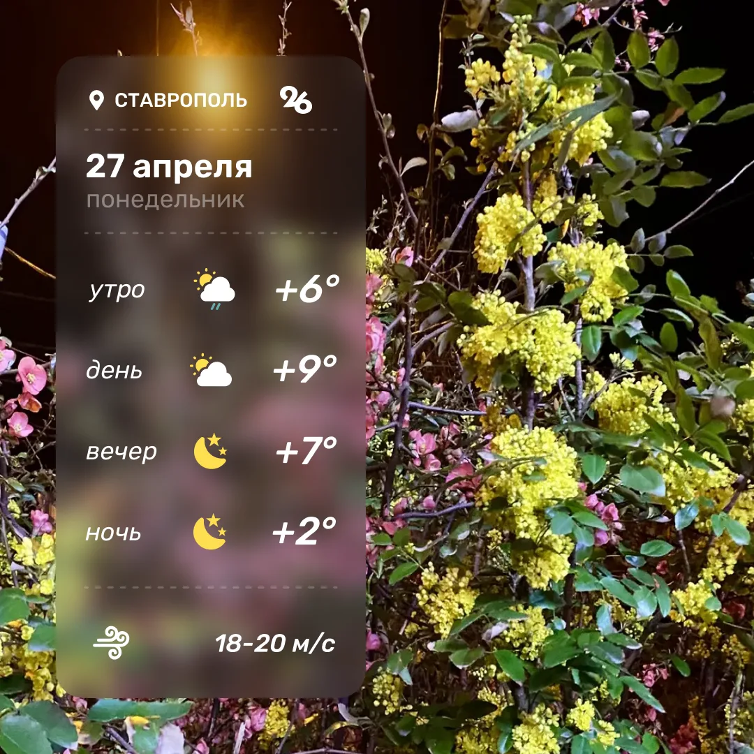 Ветер западный 6-11 м/с, порывы 15-20 м/с. В понедельник, 27 апреля, температура воздуха по краю ночью -3...+8°, днём +10...+15°.В Ставрополе без существенных осадков...