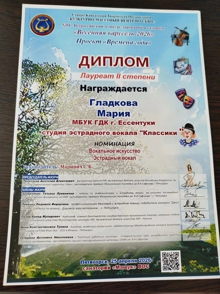 Мария Гладкова, талантливая воспитанница вокальной студии «Классики» Городского Дома Культуры, достойно представила наш город на XIII Всероссийском конкурсе «Весенняя карусель 2026» (проект «Времена года») в Пятигорске.