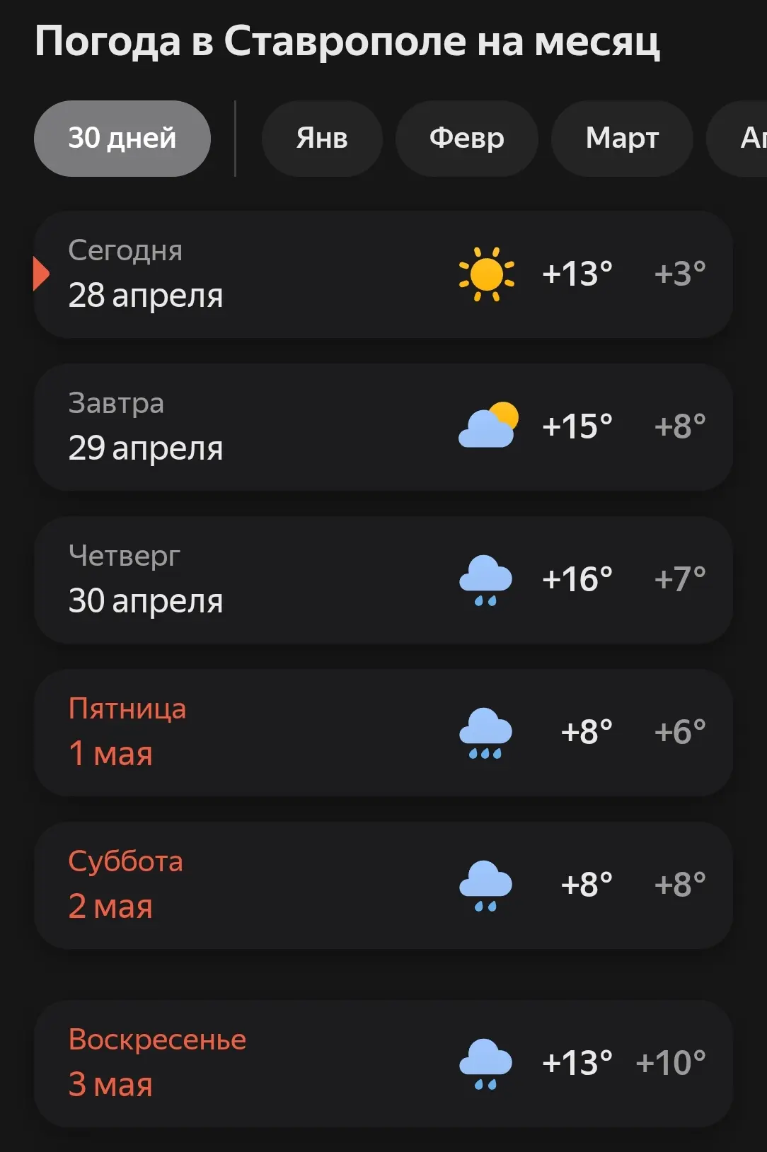 В праздничные выходные в Ставрополе будет дождливо Осадки начнутся еще в предпраздничный день, 30 апреля. Но будет хотя бы тепло – до +16.