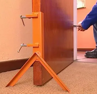Готовую распорку устанавливают в проем при выставлении коробки, фиксируя её положение деревянными клиньями. Затем распорку помещают в середину или верхнюю часть проема. Двигая центральную рейку, бруски начинают расширяться, фиксируя коробку на месте. Последующее вкручивание саморезов из-за регулировочных отверстий обеспечит достойную жесткость конструкции.