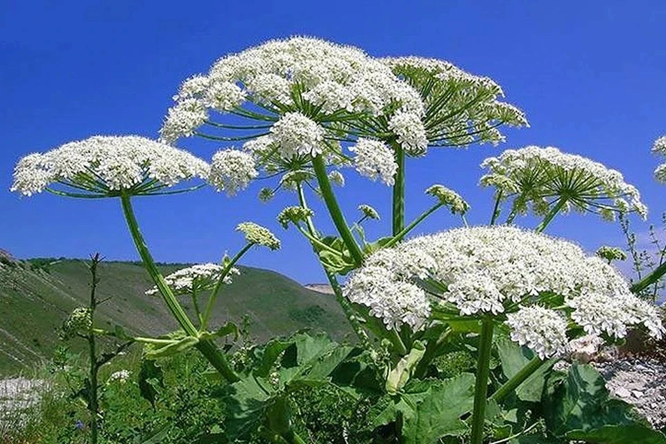 Борщевик Сосновского. Огромное растение высотой до 3-4 метров с белыми зонтиками. При попадании его сока на кожу и последующем воздействии солнца, человек получит тяжелый химический ожог с волдырями и рубцами.