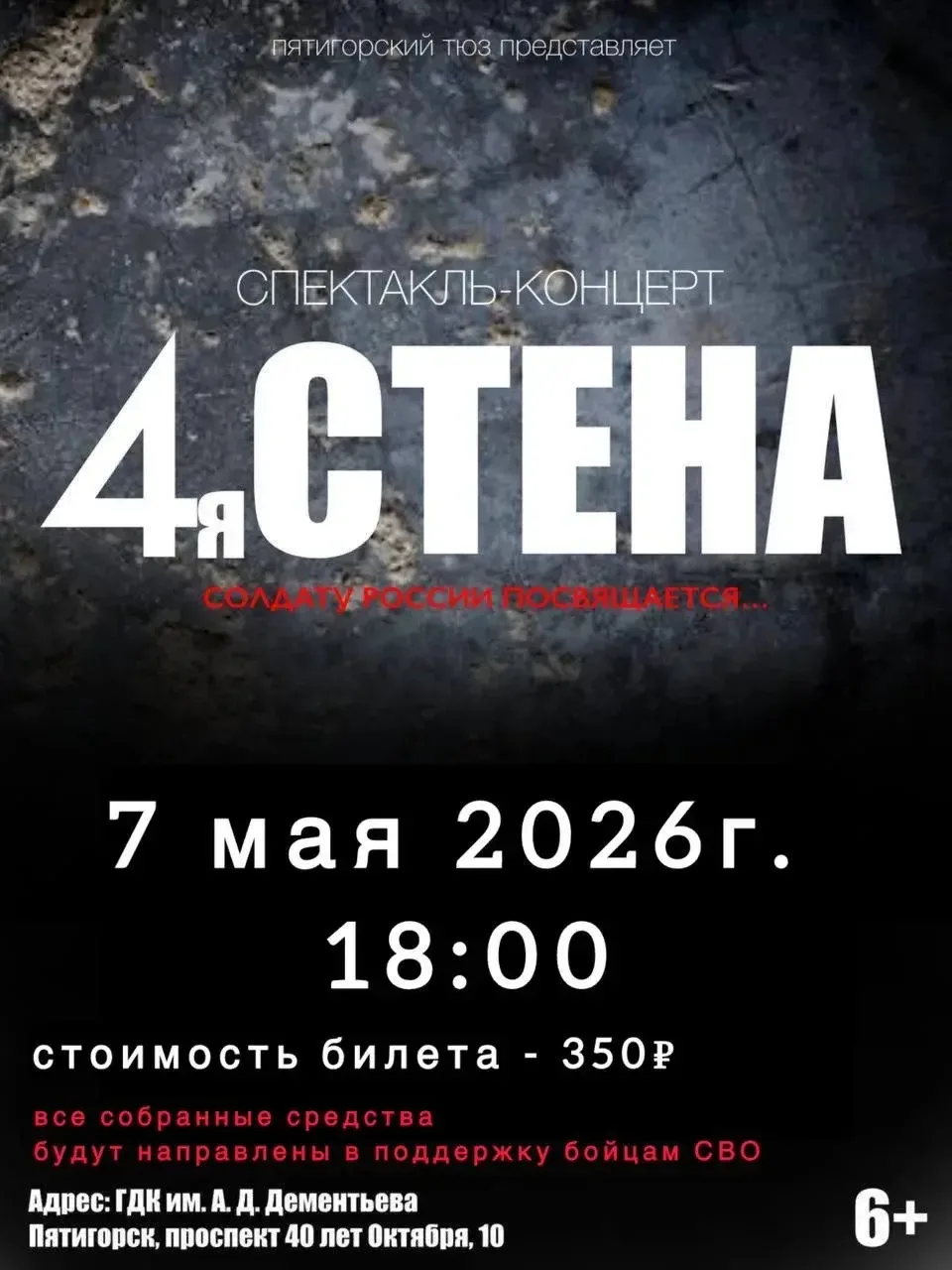 7 мая ТЮЗ ребята представят благотворительный проект «Четвертая стена». Все средства, собранные от продажи билетов, будут направлены на поддержку и помощь бойцам СВО. Начало спектакля – в 18:00, место действия – ГДК №1.