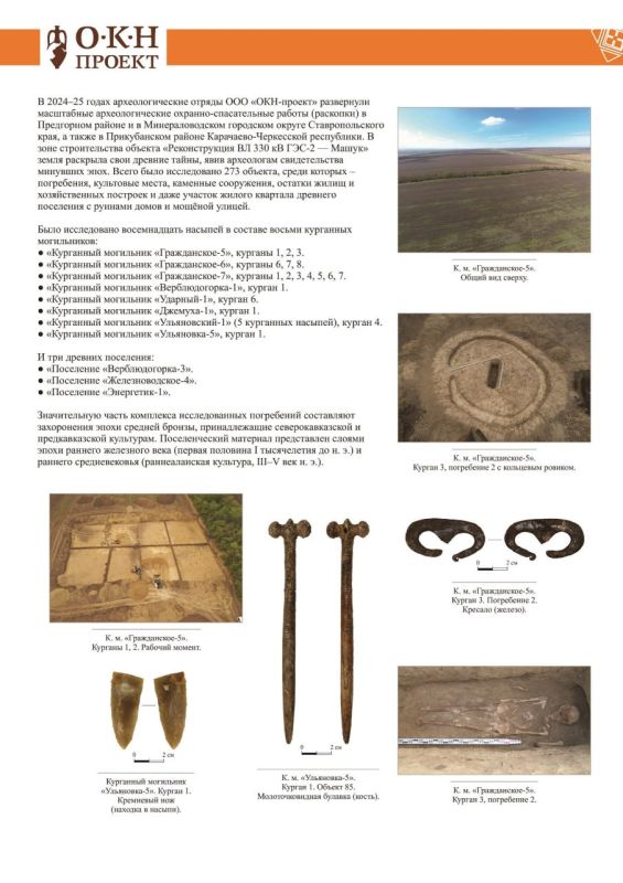 Археологи исследовали 273 объекта в Предгорном и Минераловодском округах. Специалисты проводили поисковые работы в погребениях, культовых местах, каменных сооружениях, остатках жилищ, хозяйственных постройках и участке жилого квартала древнего...